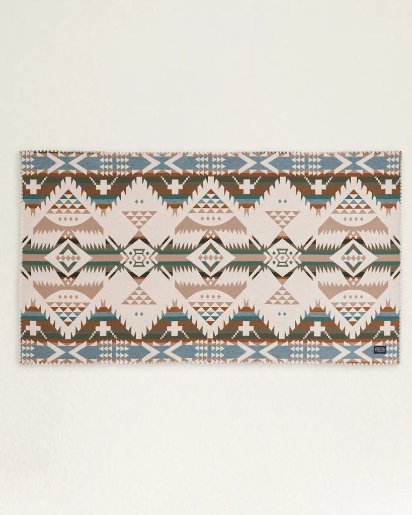 This USA-made wool saddle blanket features a pattern inspired by Nehalem—the name of a town, a river, a bay, and a park on Oregon's Pacific Coast. Large ovals show the ebbing and rising tides of Nehalem Bay, where crabbing, fishing and clamming are popular pastimes. Triangular tree shapes represent the forested bike and equestrian trails throughout the Nehalem State Park. Legends of Spanish treasure buried on nearby Neahkahnie Mountain inspire the repeated "X" in the pattern's horizontal bands.